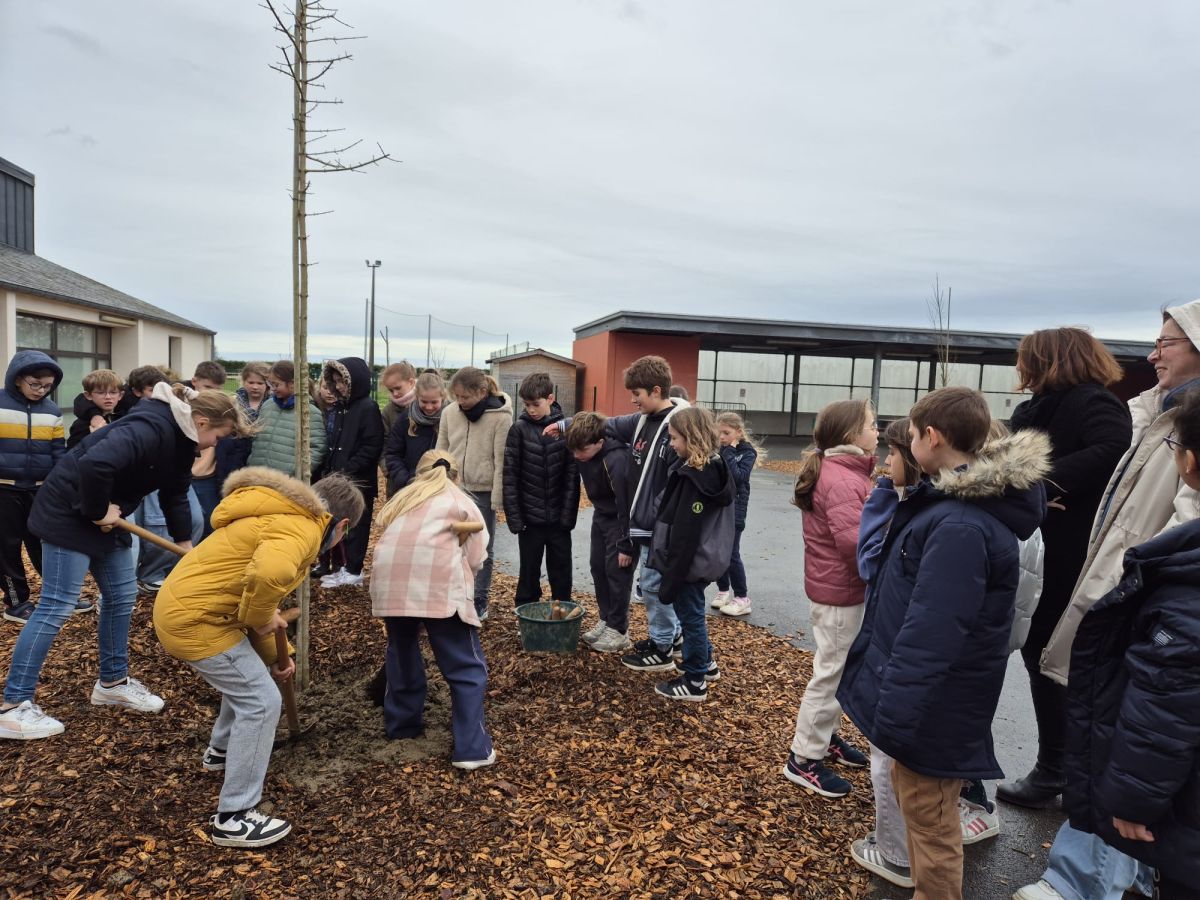 Des arbres dans la cour de l'école Jeudi 18 décembre, chaque classe de l'école élémentaire le Menhir a planté un arbre (érable ou charme) dans la cour de l'école dont une partie a été récemment décroûtée. Ces 4 arbres achetés par la municipalité rejoignent le pommier offert par le service biodiversité de Dinan...
