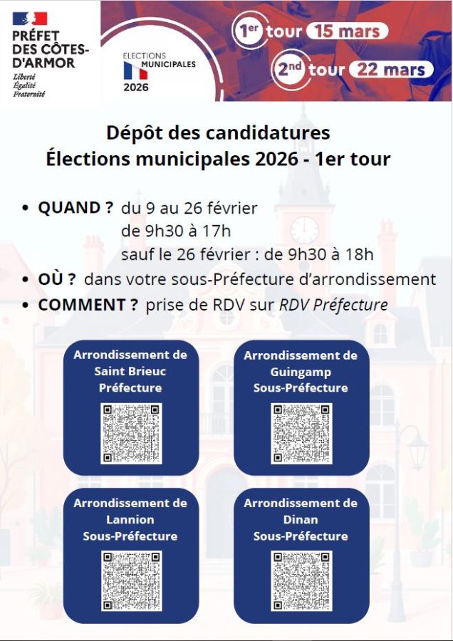 L'ensemble des informations relatives à la prise de rendez-vous pour déposer une candidature aux élections municipales et communautaires 2026 se trouvent sur le site internet de la Préfecture : https://www.cotes-darmor.gouv.fr/Actions-de-l-Etat/Elections-et-citoyennete/Elections-politiques/Elections-Municipales-2026/Je-suis-candidat