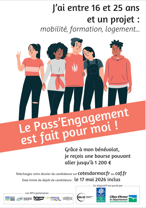 Le Pass’Engagement est un dispositif qui s’adresse aux jeunes Costarmoricains de 16 à 25 ans (2001 2010), incitant à une citoyenneté active et responsable. Il est demandé au jeune de s’engager 2 h minimum par semaine, de septembre à juin, au sein d’une association costarmoricaine, un centre social* ou une bibliothèque associative, sur une action visant à rendre service aux personnes. Il s’agira, par exemple et prioritairement, de s’engager auprès d’une association d’aide aux plus démunis, d’intervenir auprès de personnes âgées ou handicapées, de réaliser de l’aide aux devoirs, d’encadrer des activités sportives ou culturelles, bibliothèque associative etc… Cet engagement doit impérativement porter sur la notion de service rendu à la personne (en présentiel).